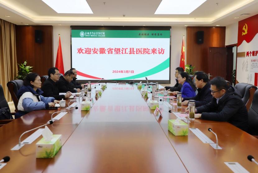 3月1日下昼,,,,,安徽省望江县医院院长曹玉华等一行来校调研交流。。。。。。我校党委委员、副校长王润霞、严继贵等校向导接待。。。。。。双方开展座谈交流。。。。。。