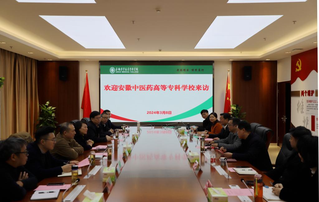3月8日下昼,,,,,,,安徽中医药高等专科学校党委委员、副校长陈静,,,,,,,党委委员、纪委书记汪学德等一行来校调研交流。。。。。我校党委副书记王劲松,,,,,,,党委委员、副校长严继贵等向导接待。。。。。双方开展座谈交流。。。。。