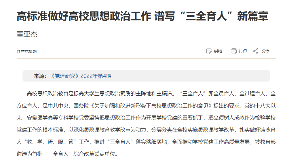 文章指出,,,,,,党的十八大以来,,,,,,安徽医学高等专科学校党委坚持把头脑政治事情作为开展学校党建的主要抓手,,,,,,把立德树人效果作为磨练学校党建事情的基础标准,,,,,,以深化思政课教育教学刷新为动力,,,,,,分层分类在全校实验思政课教学刷新,,,,,,扎实做好铸魂育人“教、学、研、服、管”事情,,,,,,推进“三全育人”落实落细落地,,,,,,周全推动学校党建事情高质量生长,,,,,,被教育部遴选为首批“三全育人”综合刷新试点单位。。。。。。。学校团结医学高等教育性子和特点,,,,,,鼎力大举实验政治“三力”(政治判断力、政治意会力、政治执行力)建设,,,,,,抓紧抓实师德师风建设,,,,,,以立德树人为基础使命,,,,,,强化意识形态阵地治理,,,,,,有用落实意识形态事情责任制,,,,,,抓好党建促引领促刷新促生长,,,,,,打造高质量头脑政治事情系统,,,,,,把党的向导落实到办学治校全历程各方面。。。。。。。