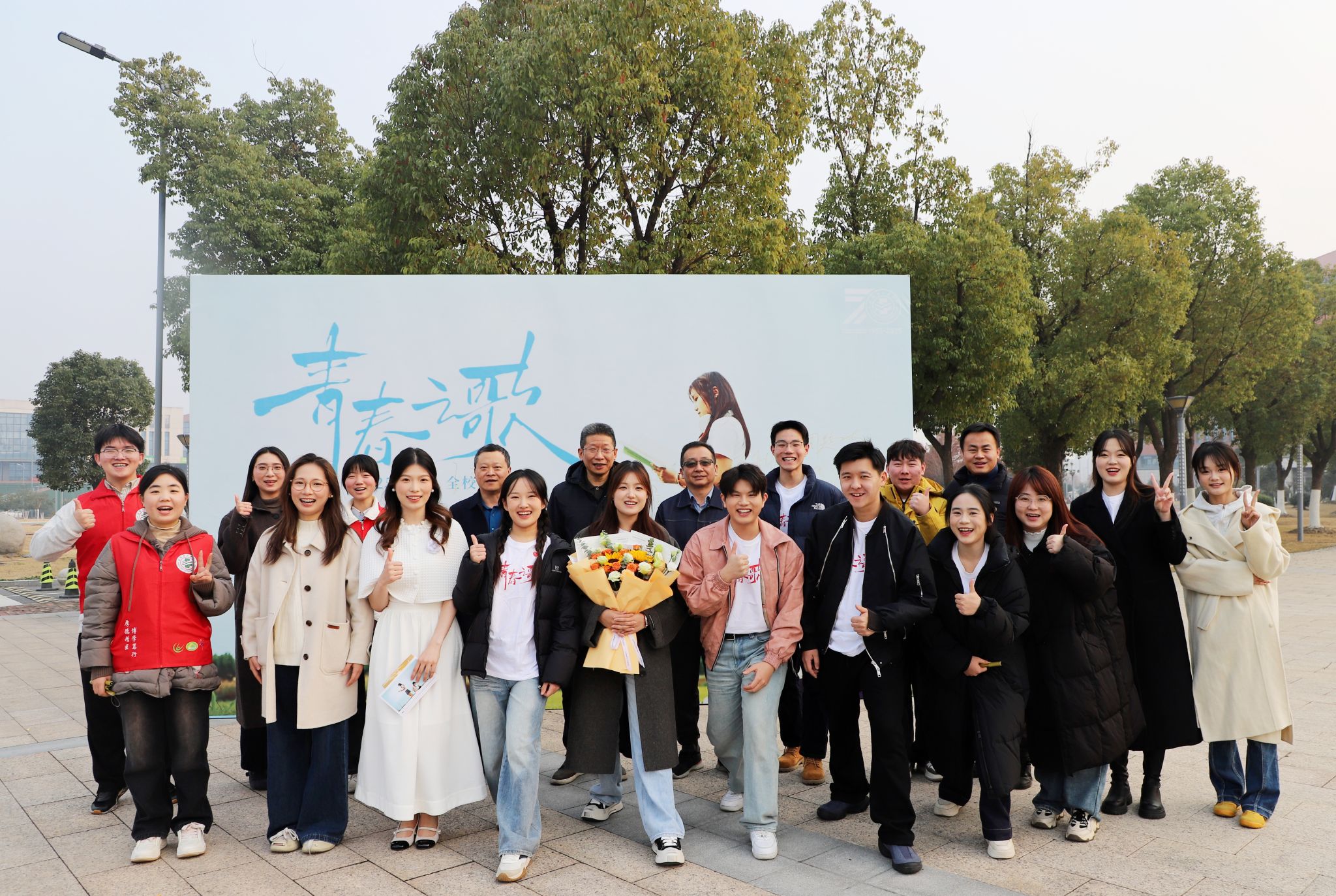 首映礼现场,,,,,,,,印着“青春之歌响山河”字样的海报前热闹特殊,,,,,,,,师生们纷纷提笔署名,,,,,,,,以文字转达对学校七十华诞的真挚祝福与青春理想的优美期许。。。。。署名墙上,,,,,,,,稚嫩笔触与成熟字迹交相辉映,,,,,,,,恰如跨越时空的对话,,,,,,,,呼应着影片“传承”的焦点主题。。。。。