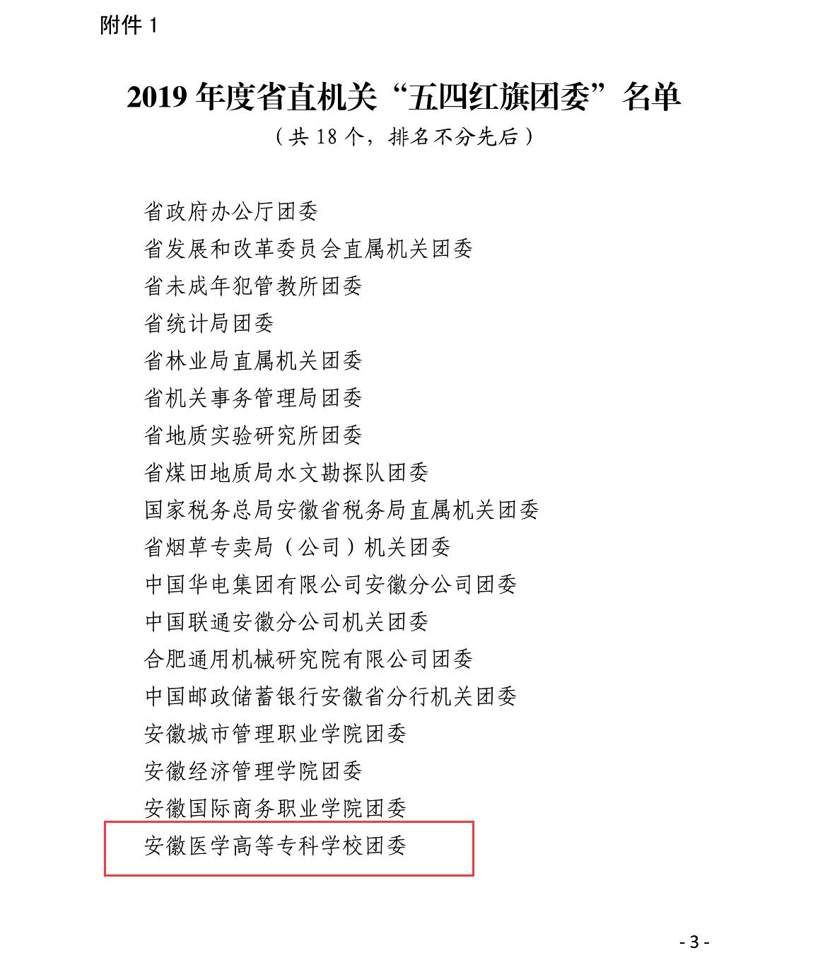 近期,,,,,,,共青团安徽省直属机关事情委员会开展“五四红旗团委(团支部)”评优表扬事情,,,,,,,共青团安徽医学高等专科学校委员会荣获表扬。 。。。。。。(撰稿、审稿:沈曼竹、周紫薇 编辑:姜楠)