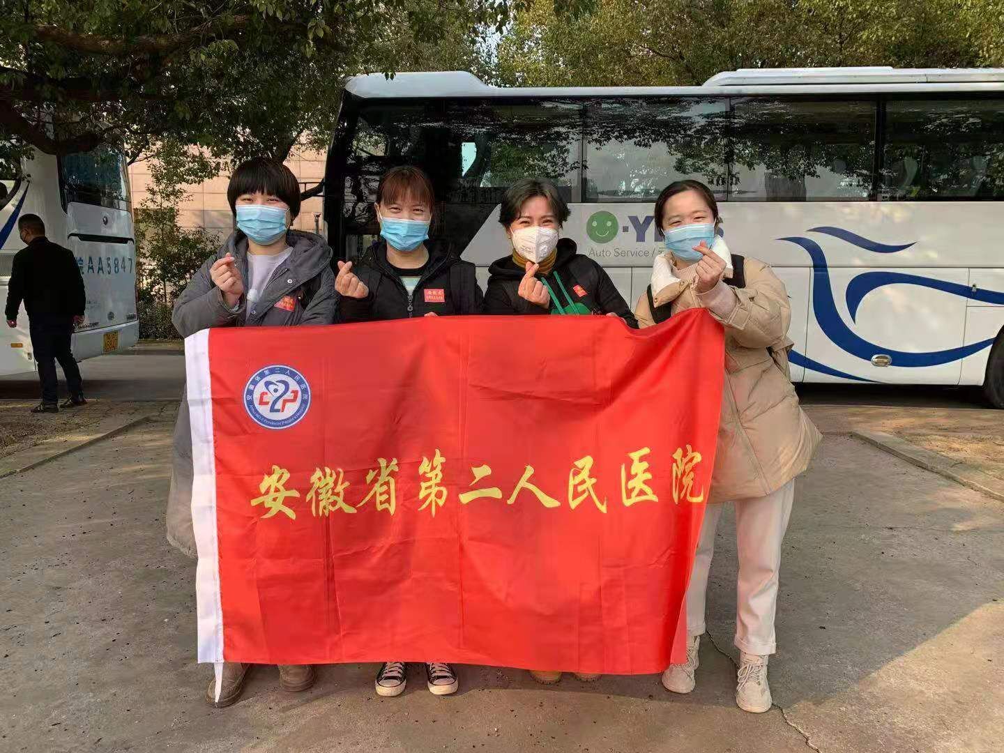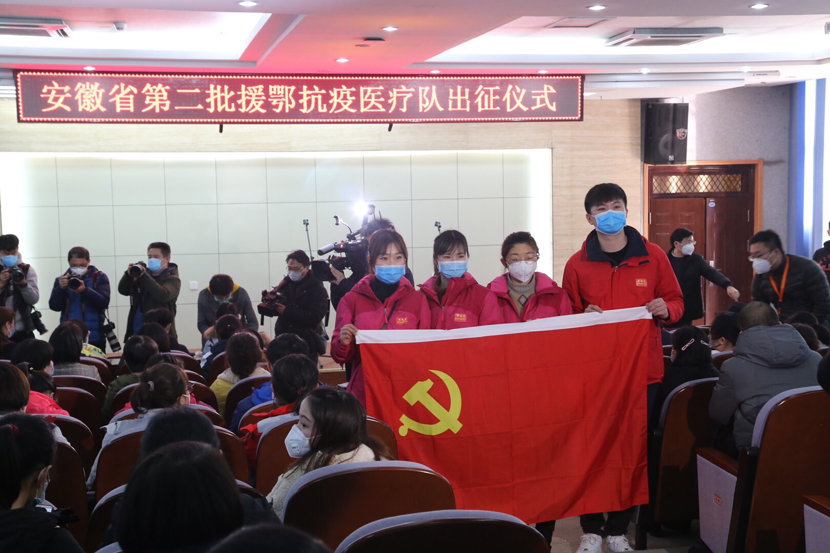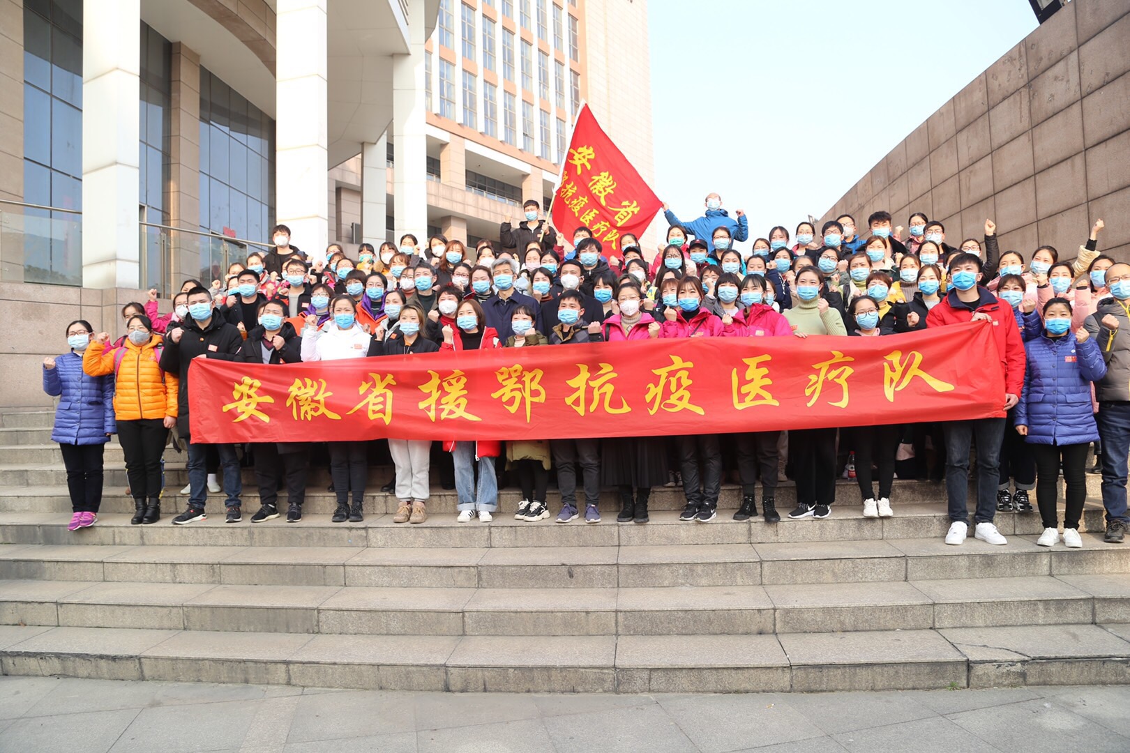 由100名医护职员组成的安徽省第二批驰援湖北的医疗队来自安徽医科大学各隶属医院、安徽省第二人民医院、中国科大附一医院(安徽省立医院)、安徽省儿童医院、皖南弋矶山医院等全省9个地市和15所省属医疗机构。。。。。