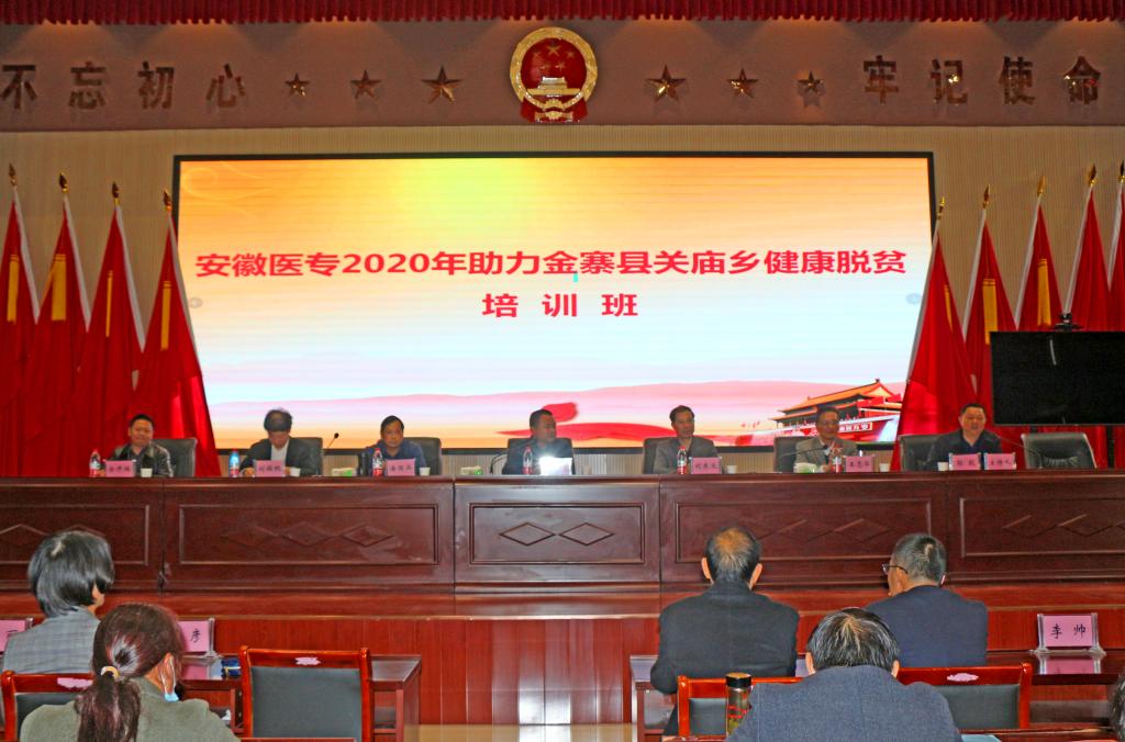 安徽医专2020年助力金寨县关庙乡康健脱贫培训班于10月20日-21日在关庙乡政府礼堂举行,,,,,,,,校党委副书记、纪委书记刘东义,,,,,,,,关庙乡政府党委书记李才军,,,,,,,,关庙乡卫生院所属医联体上级单位金寨县中医院副院长刘辑帆,,,,,,,,我校驻关庙乡大埠口村扶贫事情队队长郭毅等出席培训班开班式。。。。。。。