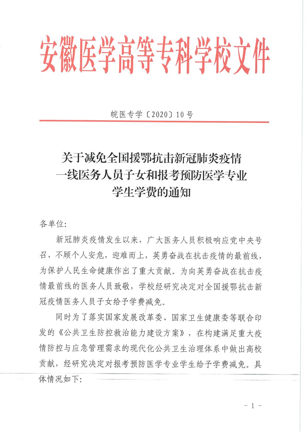 关于减免天下援鄂抗击新冠肺炎疫情一线医务职员子女和报考预防医学专业学生学费的通知