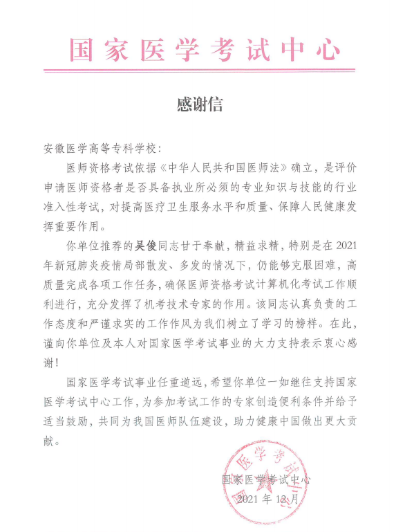 克日,,,,,,,国家医学考试中心还给我校朱霖、吴俊两位西席划分发来谢谢信。。。。。。。。谢谢信中充分一定了两位同志严酷遵守国家的执律例则和国家医学考试中心保密划定,,,,,,,甘于贡献,,,,,,,字斟句酌,,,,,,,特殊是在新冠肺炎疫情的特殊情形下,,,,,,,仍能够战胜难题,,,,,,,高质量完成各项事情使命,,,,,,,确保医师资格考试事情顺遂举行。。。。。。。。