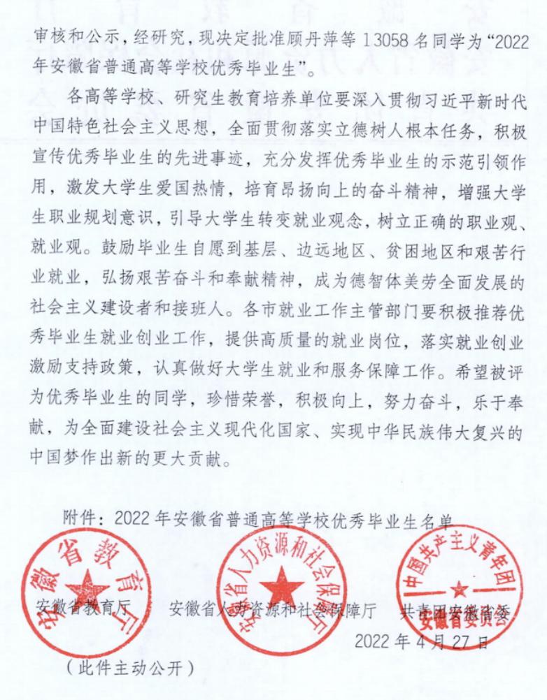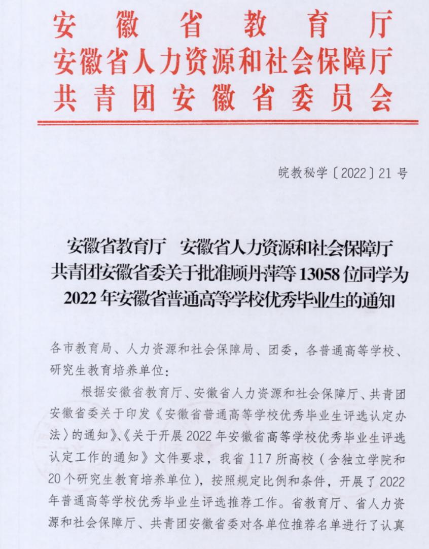 凭证《安徽省教育厅 安徽省人力资源和社会包管厅 共青团安徽省委关于印发<安徽省通俗高等学校优异结业生评选认定步伐>的通知》(皖教学[2021]1号)要求,,,,,,,各高校认真开展了评选优异结业生运动。。。。。。。。经学校推选,,,,,,,省教育厅审核公示,,,,,,,我校马群137名同砚被评为“2022年安徽省通俗高等学校优异结业生(名单附后)。。。。。。。。