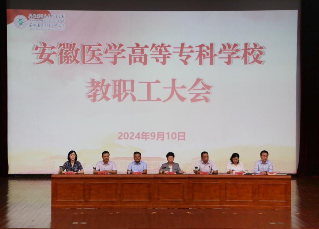 9月10日下昼,,,,,,我校召开教职工大会,,,,,,安排2024年秋季学期重点事情。。。。。全体校向导,,,,,,校本部全体教职工,,,,,,直属隶属医院(安徽省第二人民医院)、省医学科学研究院中层干部代表加入聚会。。。。。