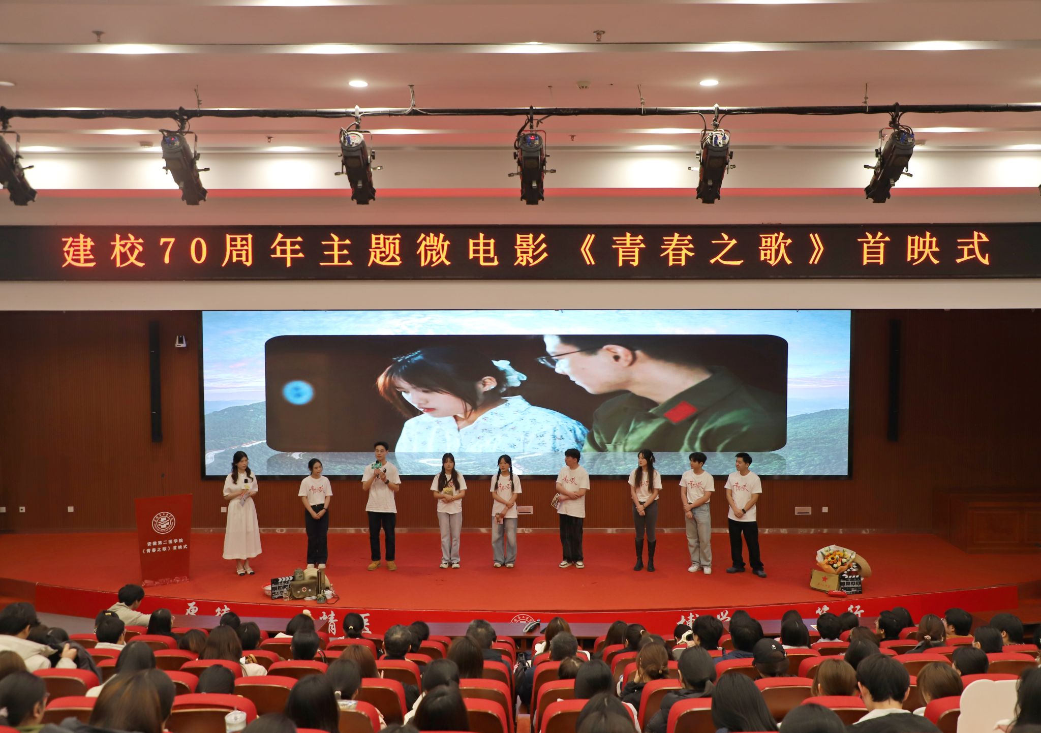 12月17日下昼,,,,,,,,安徽第二医学院建校七十周年主题微影戏《青春之歌》首映式在新桥校区勤学楼报告厅举行。。。。。校党委书记姚文兵出席仪式并讲话,,,,,,,,校向导王劲松、相关职能部分认真人,,,,,,,,《青春之歌》微影戏主创团队成员以及安徽第二医学院新桥校区部分师生代表加入首映式。。。。。