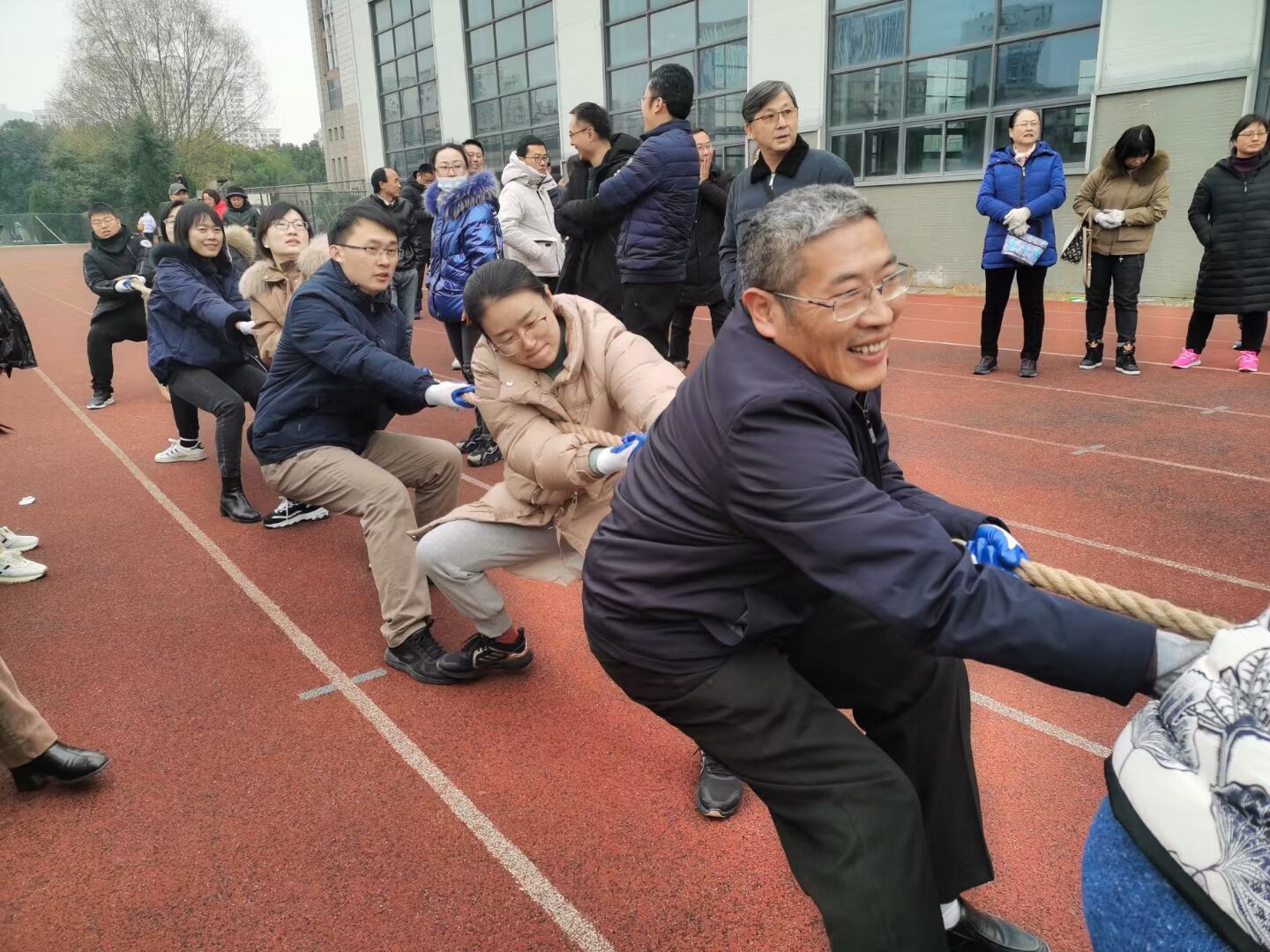 上午9时整,,,,,,角逐最先,,,,,,各个参赛队男女混搭,,,,,,每队16人,,,,,,三局两胜制。。。。。赛场上,,,,,,每位队员精神振奋、眼光坚贞。。。。。一根长长的拔河绳,,,,,,凝聚着竞赛双方的勇气、智慧和实力,,,,,,承载着教职工的激情、自信和活力。。。。。角逐双方稳扎马步,,,,,,摆好阵势,,,,,,一声令下,,,,,,双方连忙睁开“较量”,,,,,,咬紧的牙关,,,,,,攥红的双手,,,,,,斗志高昂,,,,,,团结一致。。。。。虽然正值严寒的冬季,,,,,,可是参赛队员们的心田却是热情如火,,,,,,他们充满着必胜的信心和强烈的整体声誉感。。。。。赛场上人声鼎沸,,,,,,“一二,,,,,,加油”的呐喊声此起彼伏,,,,,,震耳欲聋,,,,,,一浪高过一浪,,,,,,一直将角逐推向热潮。。。。。