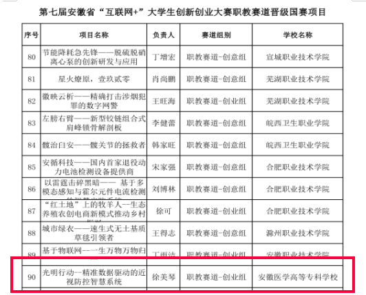 克日,,,,,第七届中国国际“互联网+”大学生立异创业大赛省级决赛和国赛资格争取赛落下帷幕。。。。。。。我校在角逐中取得优异效果,,,,,7组项目入围省赛,,,,,共斩获金奖1项,,,,,银奖1项,,,,,铜奖5项。。。。。。。其中,,,,,职教赛道金奖项目《灼烁行动——精准数据驱动的近视防控智慧系统》在排位赛中表效果优异,,,,,乐成晋级天下总决赛。。。。。。。这是我校创业项目首次入围中国国际“互联网+”大赛国赛,,,,,实现了历史性零的突破,,,,,也是我校加入该项赛事以来取得的最好效果。。。。。。。