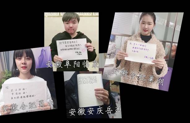 学子们在家乡在线同唱一首歌,,,,,,录制祝福视频,,,,,,手写感恩卡片,,,,,,向医护职员致敬。。。。。。。。同时面临新冠疫情全球伸张表达自己的体贴,,,,,,期待春暖花开,,,,,,安徽等你归来。。。。。。。。