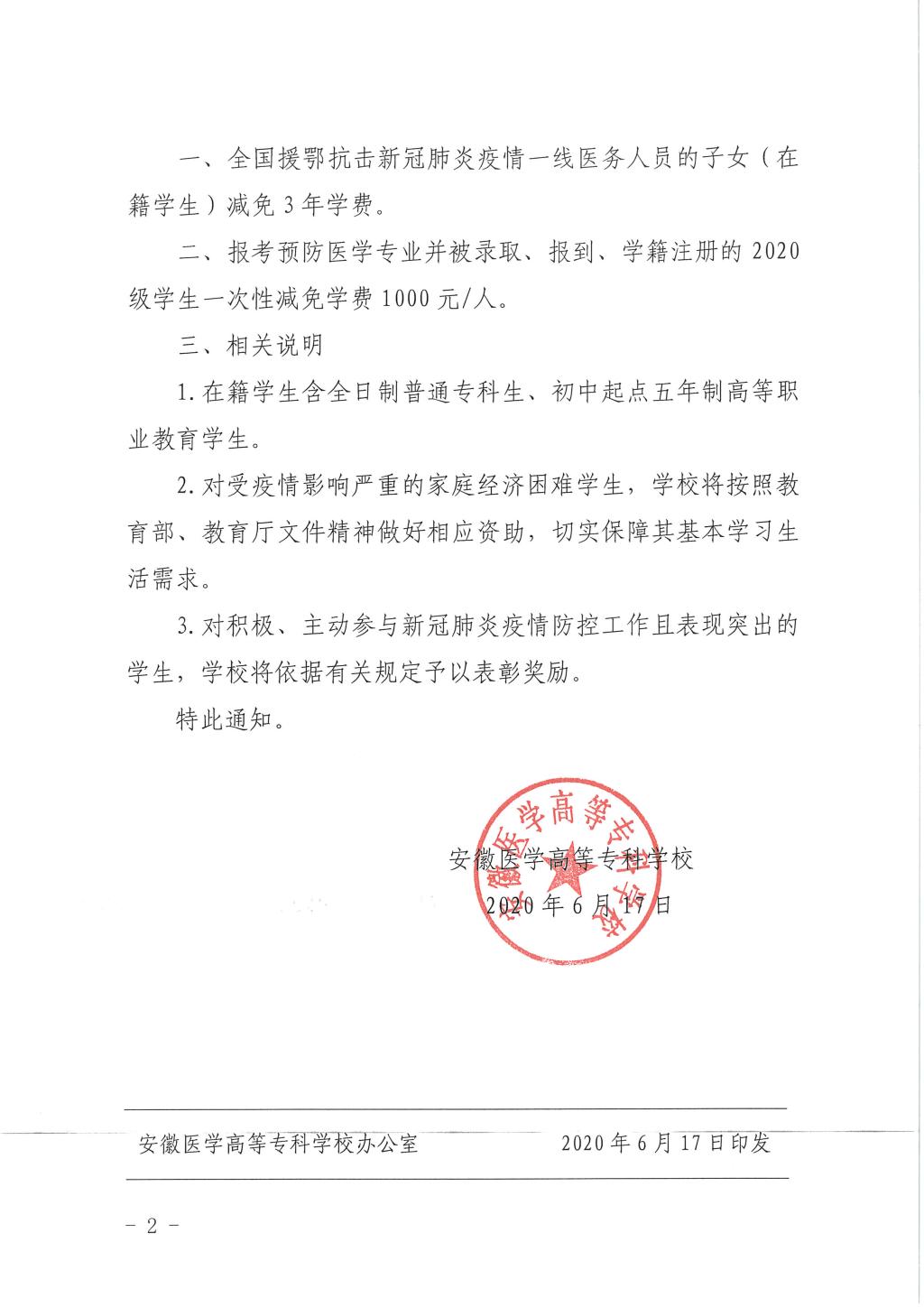 关于减免天下援鄂抗击新冠肺炎疫情一线医务职员子女和报考预防医学专业学生学费的通知