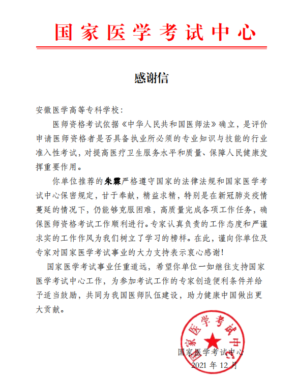 克日,,,,,,,国家医学考试中心还给我校朱霖、吴俊两位西席划分发来谢谢信。。。。。。。。谢谢信中充分一定了两位同志严酷遵守国家的执律例则和国家医学考试中心保密划定,,,,,,,甘于贡献,,,,,,,字斟句酌,,,,,,,特殊是在新冠肺炎疫情的特殊情形下,,,,,,,仍能够战胜难题,,,,,,,高质量完成各项事情使命,,,,,,,确保医师资格考试事情顺遂举行。。。。。。。。