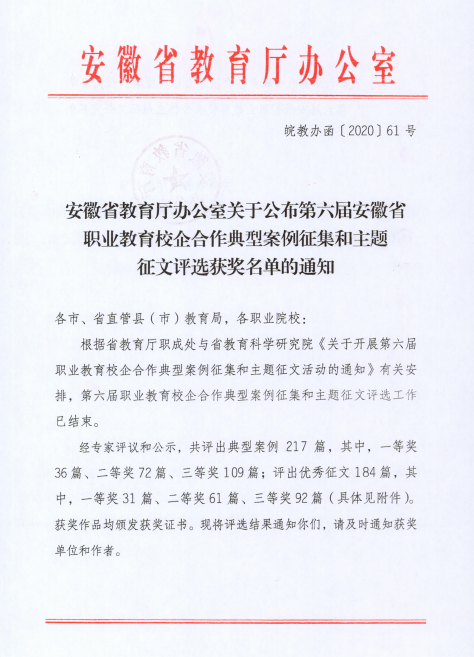 ¸½¼þ£º6-308Íî½Ì°ìº¯¡²2020¡³61ºÅ°²»ÕÊ¡½ÌÓýÌü°ì¹«ÊÒ¹ØÓÚÐû²¼µÚÁù½ì°²»Õʡְҵ½ÌÓýУÆóÏàÖúµä·¶°¸ÀýÕ÷¼¯ºÍÖ÷ÌâÕ÷ÎÄÆÀÑ¡»ñ½±Ãûµ¥µÄ֪ͨ.pdf